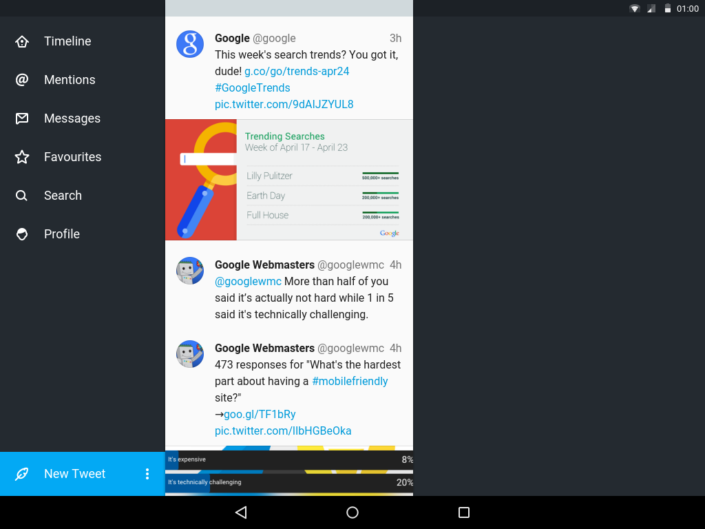 Most tablet-oriented Twitter apps used a column-based approach, which I felt was difficult to use, and didn't translate well when the tablet was held in portrait mode. So I decided to base the navigation on the original Twitter for iPad app, which uses a stack of panels to make the navigation history easily understood. Using these more-narrow columns also allowed us to add in phone compatability, which uses the exact same layouts, but instead fills a screen. Although this means no navigation is visible on a narrow phone screen, we felt it was appropriate for an app aimed at power users.